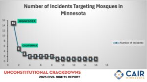 The Minnesota chapter of the Council on American-Islamic Relations (CAIR-MN) today responded to CAIR’s newly released 2025 Civil Rights Report, “Unconstitutional Crackdowns,” which highlights a troubling increase in Islamophobic incidents nationwide. Alarmingly, the report shows that Minnesota leads the country in reported incidents targeting mosques, with 15 documented cases in 2024—three times higher than the next highest state, California.